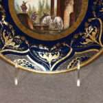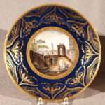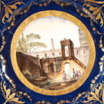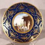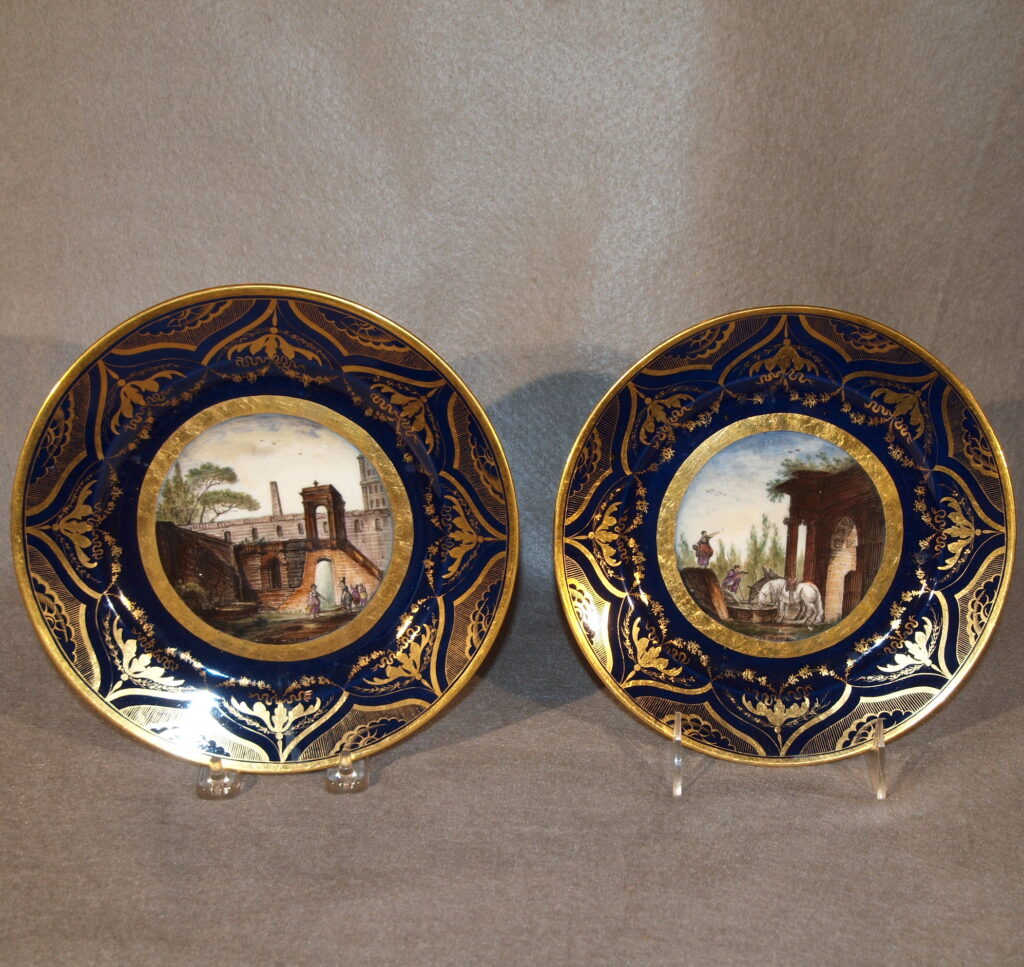 Darte Freres Pictorial Plates, Ca. 1830. One plate with “VUE FRES DE ROME” inscribed at the bottom of a church yard scene. The other plate with “VUE DE NAPLES.” at the bottom of a Roman ruins scene. The central views surrounded by a dark cobalt blue and stylized floral patterns in gold. Each back with the maker’s mark “DARTE F.”
