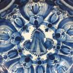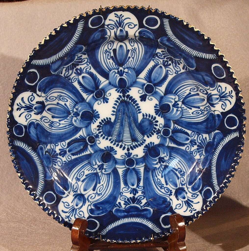 Dutch Delft Charger from the 2nd half of the 18th century. The center with a stylized large tulip. The crinulated edge surrounding vignettes with stylized floral and leaf design. The back bears a mark “B:P:” for De Vergulde Blompot factory.