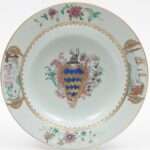 An English Cream Ware plate with the decoration done in Holland. The subject is from a series of scenes that tell the story of the Prodigal Son. This one translates as “In Misery”. The decoration is all over the glaze and very colorful. I find this one humorous as I look at the pigs.