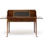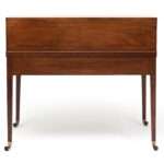 The upper case sits upon a case of two short and one long drawer in the front and a pull out slide on each side above false drawers. The square tapered legs with line inlays and rectangular panels with inverted corners. All upon brass casters.