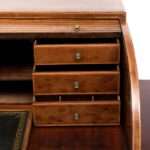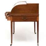 George III Writing Desk with a tambour top made around 1800. It is made from (faded) mahogany with line inlays and decorative curly satinwood. The top with a muliti- striped tambour top opening to reveal an adjustable leather topped writing surface, cubby holes and drawers.